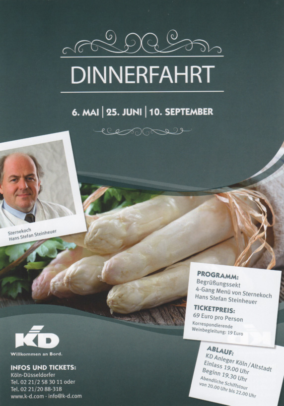 Als besonderes Highlight hat die KD eine Kooperationsvereinbarung mit dem 2-Sterne Koch Hans Stefan Steinheuer aus dem Ahrtal geschlossen - laut Gault Millau einer der „weltbesten Köche" . Am 6. Mai wird Steinheuer das für die KD kreierte Frühlingsmenü erstmals auf einer Abendfahrt an Bord der KD in Köln präsentieren. Das Dinner wird in vier Gängen serviert und lädt zum gemeinsamen Genießen ein - natürlich mit passender Weinbegleitung.