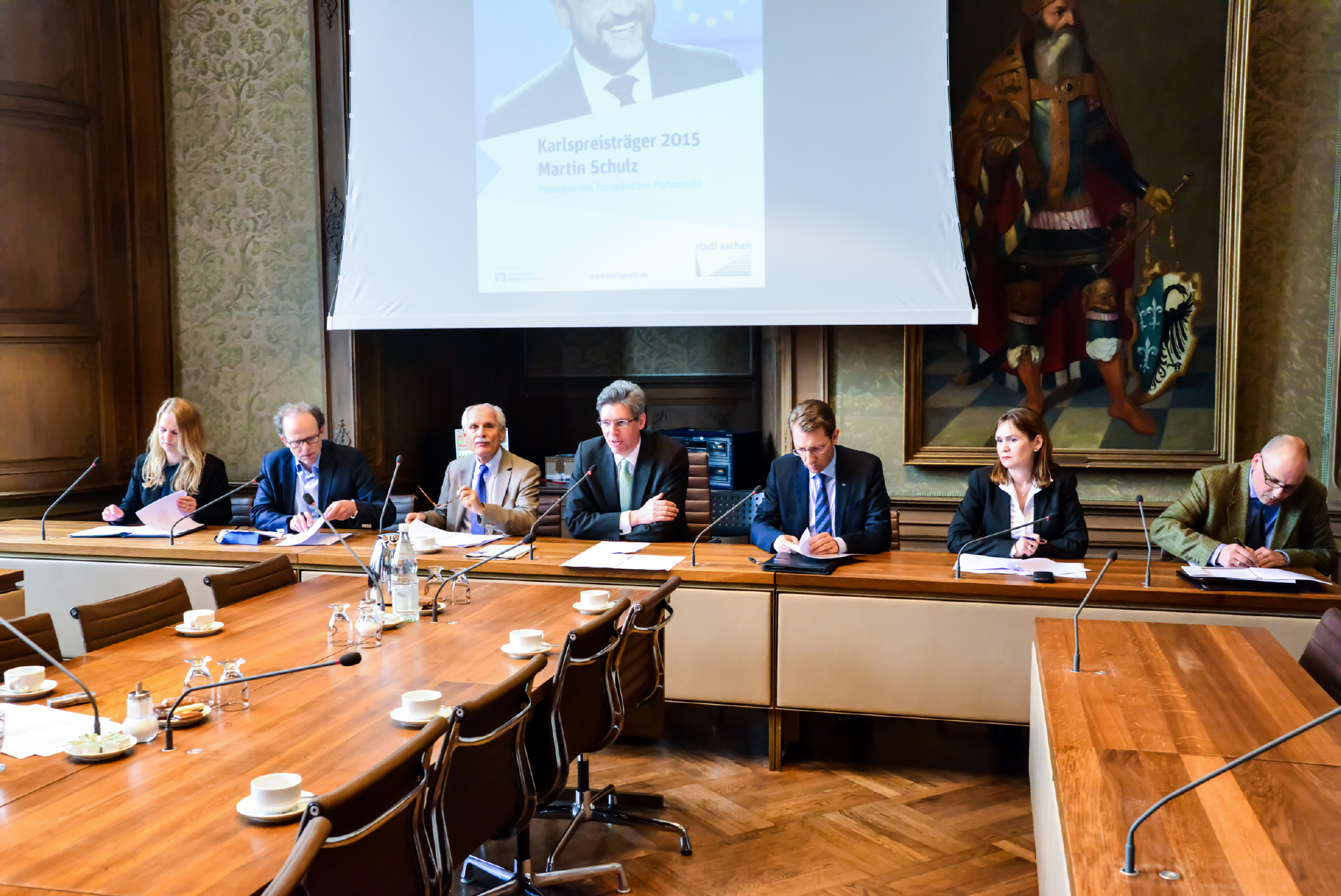 Nur wenige Tage vor der Verleihung des Internationalen Karlspreises zu Aachen an den Präsidenten des Europäischen Parlaments, Martin Schulz, am 14. Mai haben jetzt Oberbürgermeister Marcel Philipp und Dr. Jürgen Linden als Vorsitzender des Karlspreisdirektoriums Einzelheiten zum aktuellen Stand der Vorbereitungen bekannt gegeben. Demnach werden an diesem Himmelfahrtstag 2015 bis jetzt allein sieben Staatsoberhäupter in Aachen erwartet: Bundespräsident Joachim Gauck, der französische Staatspräsident François Hollande, der jordanische König Abdullah II. bin al-Hussein, König Felipe VI. von Spanien, der finnische Präsident Sauli Niinistö, Petro Poroshenko, Staatspräsident der Ukraine, sowie die litauische Präsidentin und Karlspreisträgerin Dalia Grybauskaité.