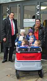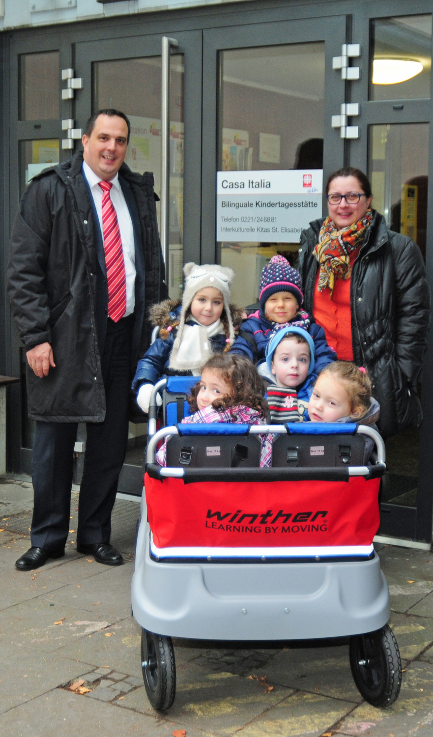 „Wir haben erfahren, dass Ausflüge mit den ganz kleinen Kindern wie zum Weihnachtsmarkt hier mitten in der Stadt schwierig und gefährlich sind. Ein Kinderwagen für mehrere Pänz wäre da sehr hilfreich und dringend notwendig“, erklärt Tom Tröbs sein Engagement. Gemeinsam mit dem befreundeten Hilfsvereins „himmel & ääd e.V. - för Kindersielcher en Nut“ wurde daher ein geeigneter, strapazierfähiger Wagen mit Platz für sechs Kinder ausgesucht und für die Kita an der Kirche St. Gereon im Herzen Kölns neu angeschafft. Die Leiterin Maria Lamaina lud auch gleich zum gemeinsamen Spaziergang mit den Jüngsten ein, die begeistert das große Gefährt bestiegen. „Einige unserer Kinder sind noch keine drei Jahre alt und werden bei unseren vielen erlebnisreichen Touren durch die Stadt schnell müde“, so Maria Lamaina. „Mit dem XXL-Kinderwagen können die Kleinen nun auch mal verschnaufen und sind dabei stets sicher.“