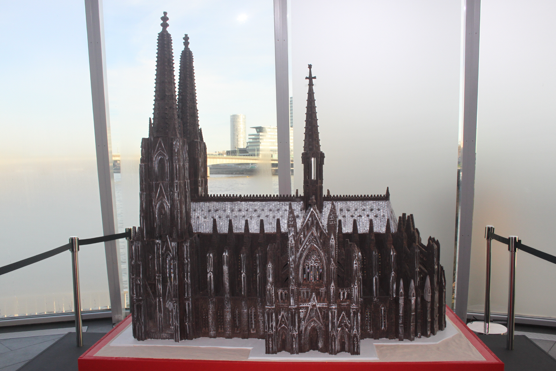 Der Kölner Schokoladen-Dom entstand durch die Manufaktur A.M. Schoko im bayrischen Freising. Das Kunstwerk wurde in 600 Arbeitsstunden geschaffen und ist eine originalgetreue Nachbildung des Kölner Doms in den Maßen: 1:100. Dementsprechend hat die Skulptur eine Höhe von 1,58 Metern, eine Länge von 1,46 Metern und eine Breite von 0,82 Metern.