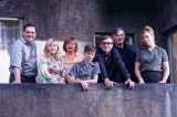 Filmfamilie Collien mit Regisseur Winkelmann und den Produzenten auf dem Balkon der Wohnung von Familie Collien, nachgebaut in den MMC-Studios in Köln-Ossendorf.