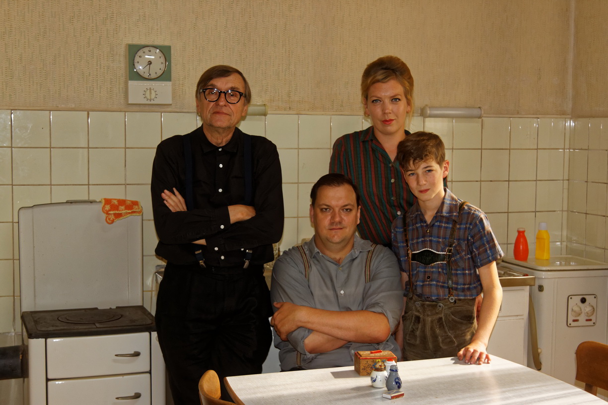 Die Filmfamilie Collien (ohne Tochter, rechts) und Regisseur Adolf Winkelmann in der Küche der Wohnung der Familie Collien, nachgebaut in den MMC-Studios in Köln-Ossendorf.