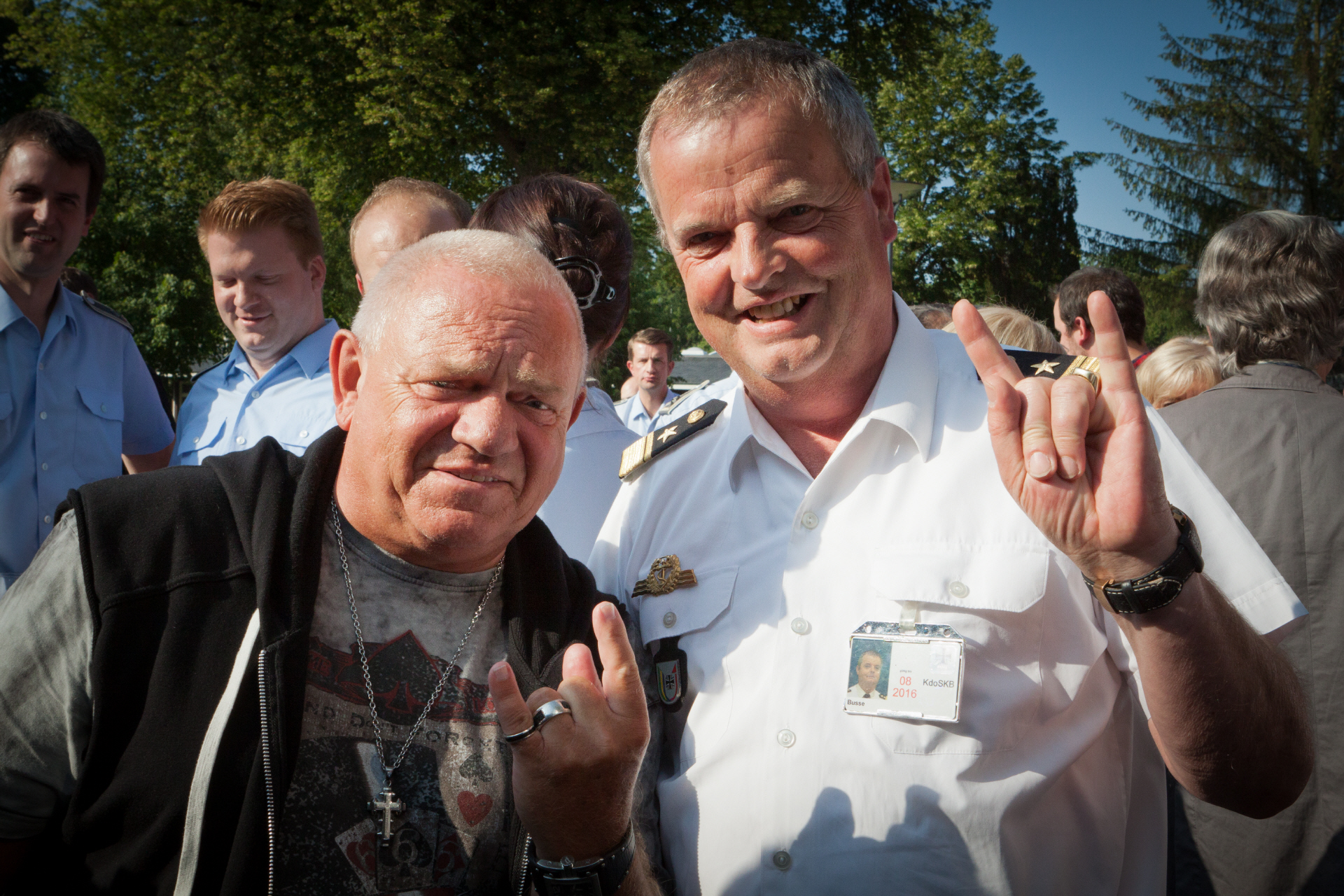 Im Anschluss an die Vorpremiere bedankte sich der Leiter des Musikkorps der Bundeswehr Oberstleutnant Christoph Scheibling zunächst bei Udo Dirkschneider für die hervorragende Zusammenarbeit. "Wir möchten Dir gerne auch von der Bundeswehr ein Stück Heavy Metal überreichen. Deshalb erhältst Du von uns das Verbandsabzeichen des Musikkorps - als Metall zum Anstecken, sozusagen die 'Heavy Medal'." Beim abschließenden Grillen gab es für die Journalisten, Soldaten, Rockmusiker und Sängerin noch reichlich Gelegenheit zu Gesprächen. Zum Ende der gelungenen Veranstaltung waren sich alle einig: Wacken 2015 wird groß!