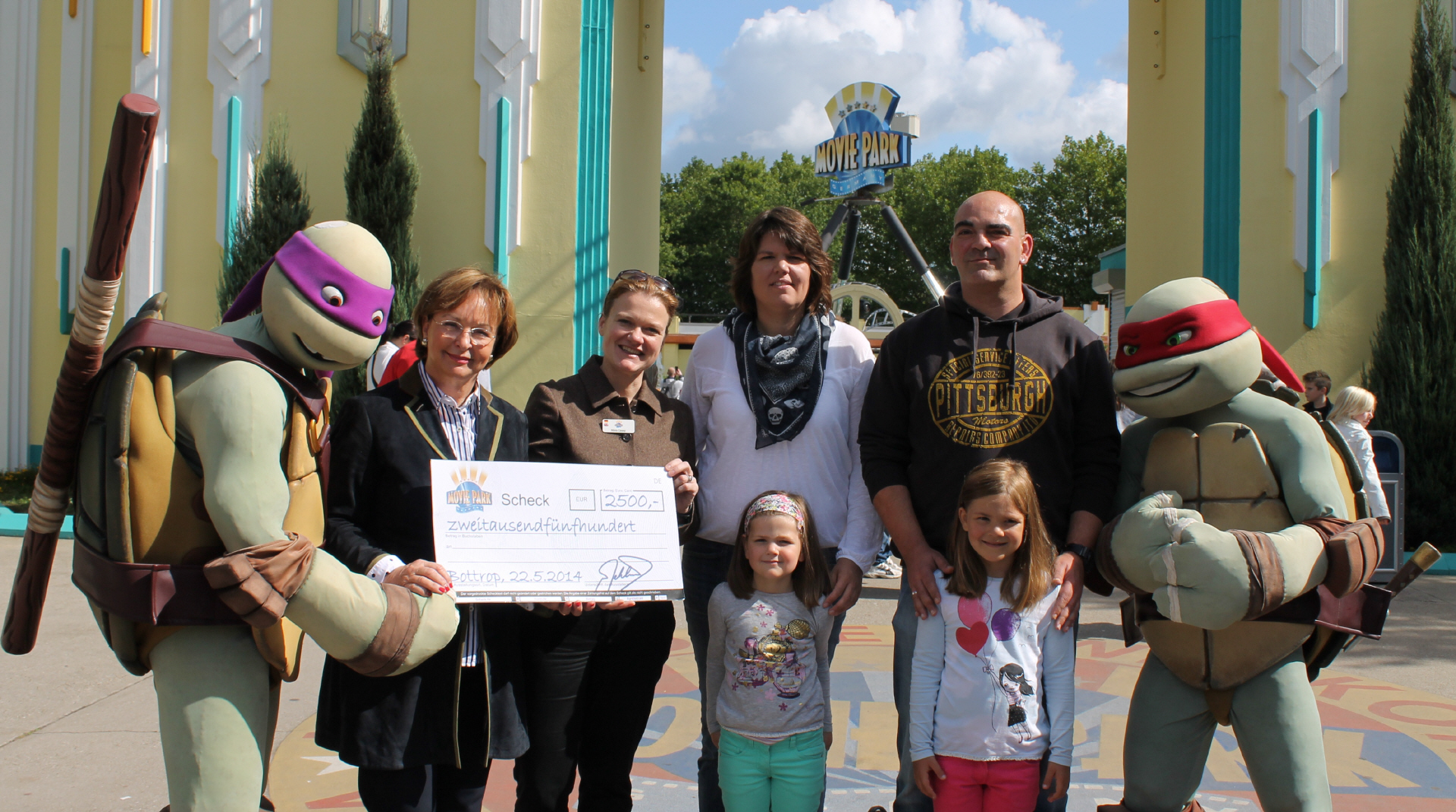 Als Ur-Münsteraner fiel Familienvater Markus Frenk die Wahl nicht schwer. „Wir haben in der Zeitung so oft von Herzenswünsche e.V. gelesen, dass die Entscheidung schnell gefallen war.“ Jetzt übergaben Markus, Jessika, Madita und Rabea Frenk zusammen mit dem Movie Park Germany die 2500 Euro an Herzenswünsche e.V. mit Sitz in Münster. Die 1. Vorsitzende, Wera Röttgering, nahm den Scheck freudestrahlend entgegen. „Vielen Dank, dass Sie bei Ihrer Wahl direkt an uns gedacht haben.“ Eine Idee, was mit dem Geld passiert, entwickelte sie direkt vor Ort. „Ich kann mir vorstellen, dass wir damit Familien aus sozial schwachen Verhältnissen oder Familien mit schwer kranken Kindern und Jugendlichen einen Kurzurlaub im Movie Park ermöglichen und damit eine Entspannung vom Alltag bieten.“ Für Mutter Jessika eine schöne Sache: „Wir haben unser Glück einfach nur weitergegeben.“