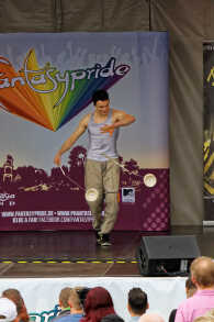Zum normalen Eintrittspreis des Phantasialand gab es heute auf dem Kaiserplatz im Themenbereich Berlin auf der Fantasypride-Bühne ein zusätzliches Show-Programm zur Eröffnung des ColognePride mit musikalischen Beiträgen, dem Flic Flac-Jongleur Nocolai Kuntz, einer Tanzgruppe und der launigen Moderation von Danny Frede alias "Erika Laste", der letzten im Dienst befindlichen DDR-Grenzerin. Weiter ging es mit einem Wet-T-Shirt-Contest für Herren. Und auch hier wurde es musikalisch, u. a. mit Marcel Kaupp alias "Marcella Rockefeller", bekannt u. a. aus der RTL-Show "Das Supertalent" (2014). Um 20.00 Uhr musste Mann sich dann entscheiden - geht es zur Junggesellenversteigerung auf dem Kaiserplatz oder lieber zur Fantasypride-Show ins Silverado Theater. Letztere bot Unterhaltung par excellence, u. a. mit Marcella Rockefeller, Deborah Woodson, der Schlager-Boyband "Feuerherz", Christian Tesch (bekannt aus der letzten Staffel von "Deutschland sucht den Superstar") und Kay Ray. Moderiert wurde auch dieser Abend von Erika Laste (alias Danny Frede). Wer dann noch nicht genug gefeiert hatte, konnte bis 4 Uhr morgens bei der FantasyPride-Party in Wuze Town weitermachen. Gleich sechs DJs liessen hier die Plattenteller rotieren und machten die Nacht zum Tag. Als Clou liefen diese beiden Indoor-Achterbahnen "Winjas Force" und "Winjas Fear" durchgehend weiter und so konnte das Partyvolk zwischendurch über die Köpfe der Mitfeiernden rotieren ...