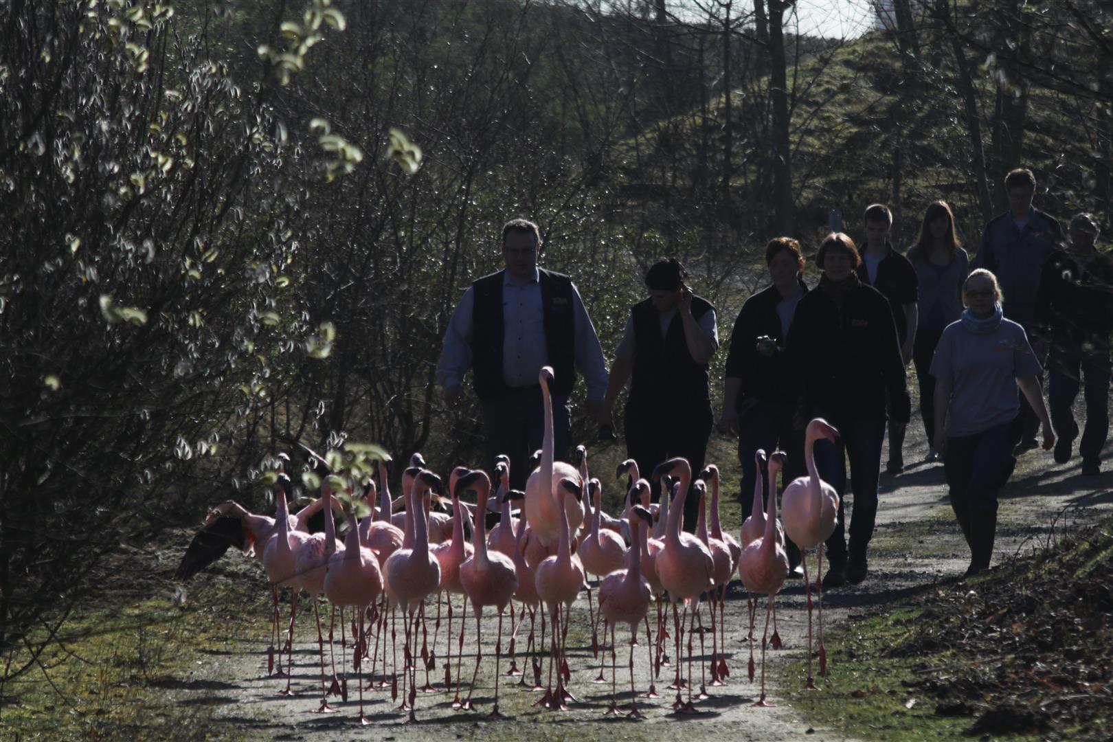 Heute durften die 34 Zwerg-Flamingos und zwei Rosa Flamingos wieder auf ihre drei Inseln auf dem großen Afrika-See umziehen. Zwei der Flamingos wurden dafür von den Tierpflegern unter dem Arm bis zum See getragen. Sie dienten als Lockvögel für den Rest der Flamingo-Gruppe. Die anderen Vögel mussten selber laufen.