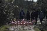 Nach nur gut vier Monaten haben heute 36 Flamingos in der ZOOM Erlebniswelt ihr Winterquartier verlassen. Seit dem 7. November 2013 lebten die langbeinigen Vögel in der afrikanischen Dschungelhalle hinter den Kulissen. Dort haben sie eine Wiese unter freiem Himmel zur Verfügung, eine Wasserfläche ist im Haus vorhanden.