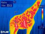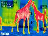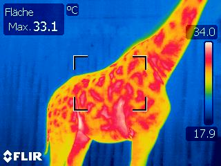 Tierärztin Dr. Pia Krawinkel schaute ganz genau hin. Dass Giraffendame Mary bereits in den nächsten Wochen Nachwuchs erwartet, ist bei ihrem prallen Bauch auch ohne Thermografie nicht zu übersehen. Auf den Aufnahmen der Wärmebildkamera erkennt man an den fast weißen Färbungen in Marys Bauchbereich die dort herrschende hohe Temperatur (siehe Foto; Mary links). Aus dieser erhöhten Wärme kann man auf den bald zu erwartenden Giraffennachwuchs schließen.