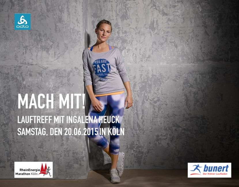Am Samstag, 20. Juni 2015, laden der RheinEnergieMarathon Köln, der Ausrüster ODLO sowie Sport Bunert zu einem kostenlosen Lauftreff mit Ingalena Heuck in Köln ein. Die diplomierte Sportwissenschaftlerin, Ernährungsberaterin und ehemalige deutsche Meisterin im Halbmarathon gibt wertvolle praktische Tipps rund um die Vorbereitung auf die Wettbewerbe des Köln Marathon am 4. Oktober 2015.